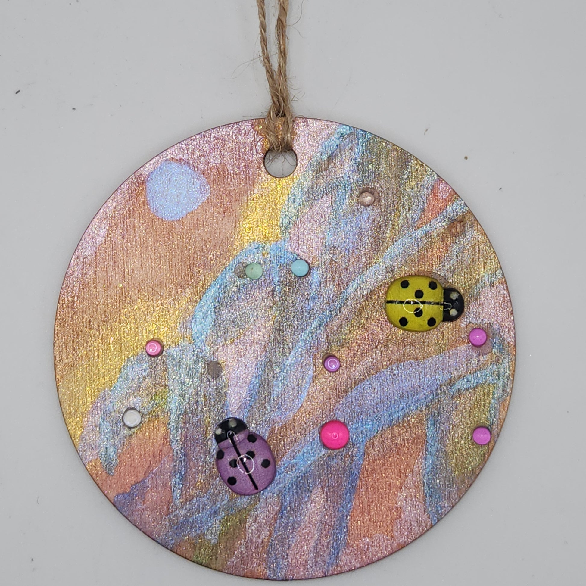 Two charming ladybugs grace a delightful scene on a round disk, adding a touch of whimsy and fun.