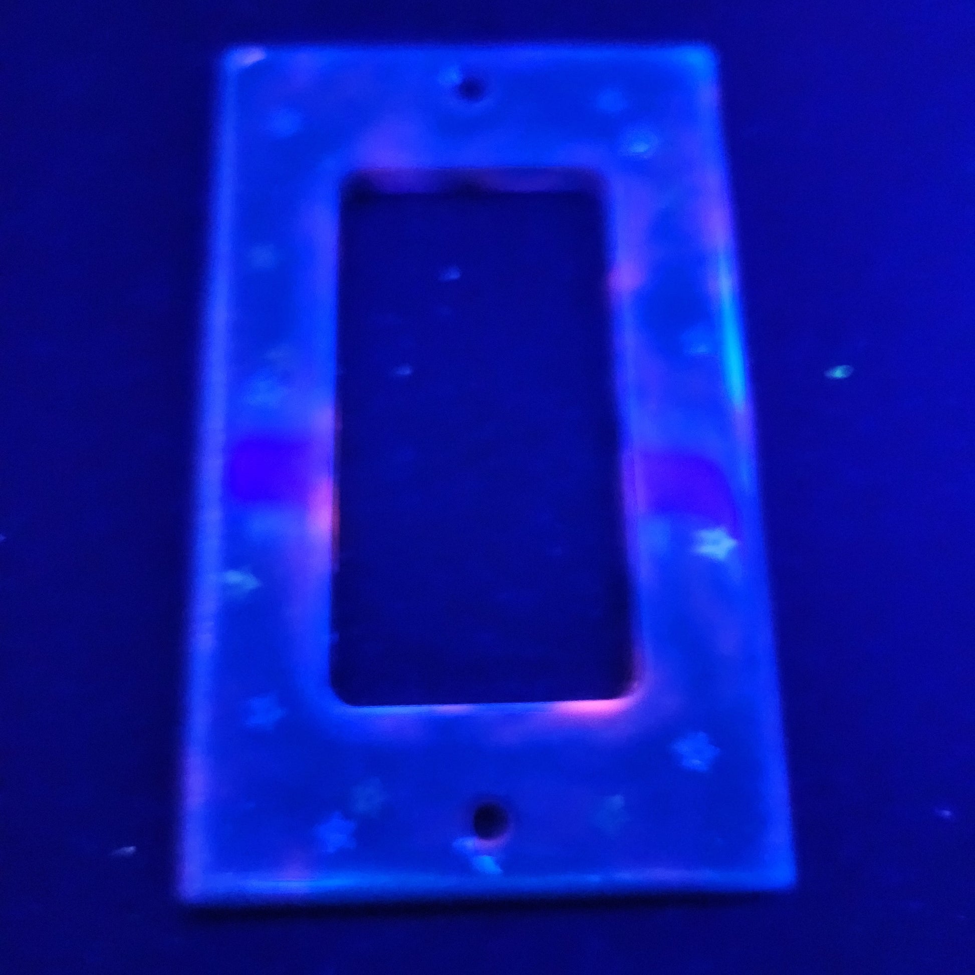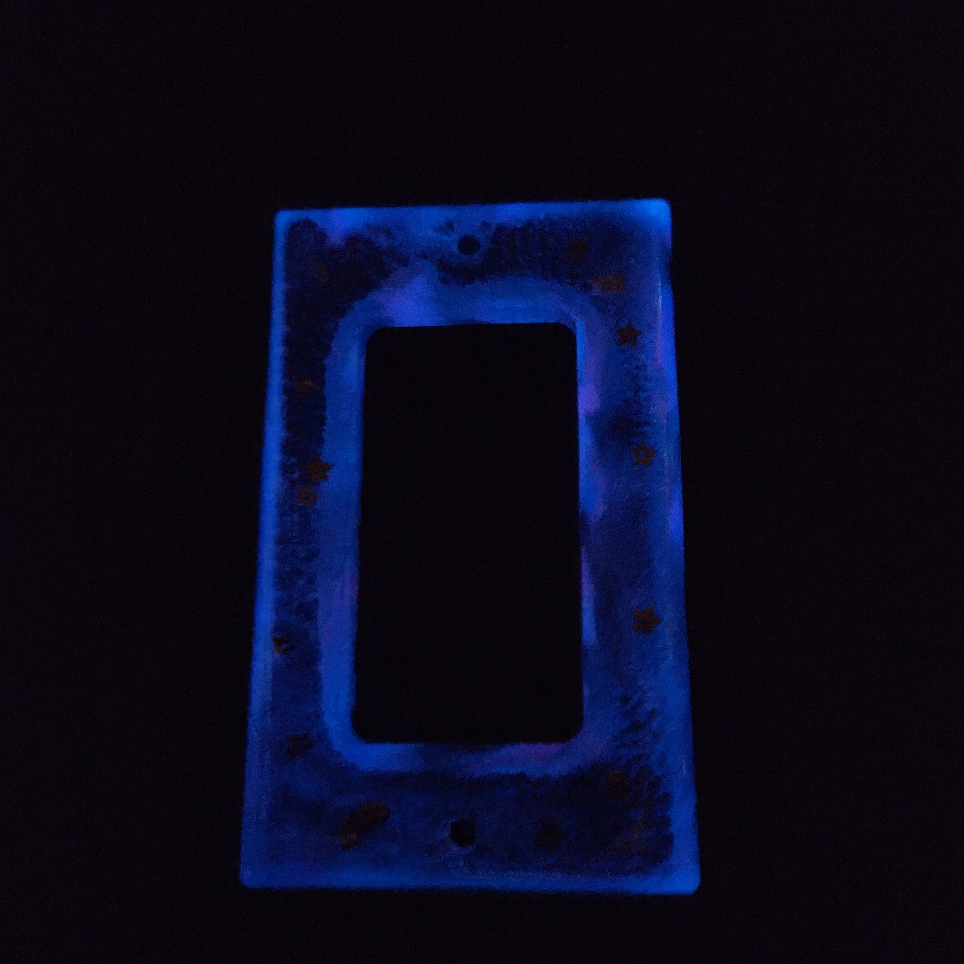 This light switch cover shines in the dark and lights up under UV or blacklight. Decorated with sparkling gold and silver stars against a cosmic galaxy backdrop, it’s a magical addition to any room. Grab this enchanting plate and brighten your space with a touch of the universe!