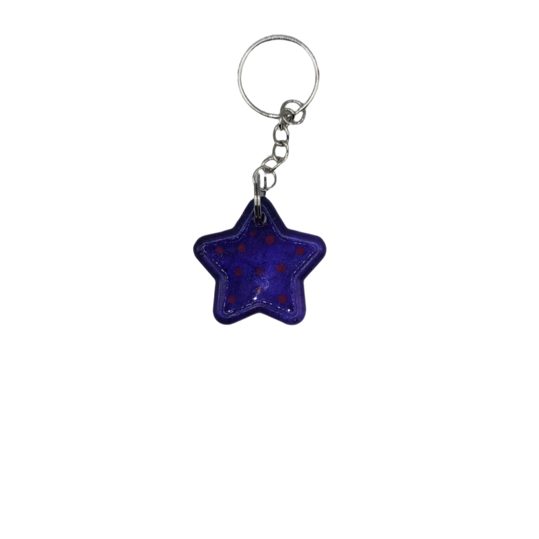 This purple star key-chain sparkles with glowing purple dots that shine under blacklight and UV light.